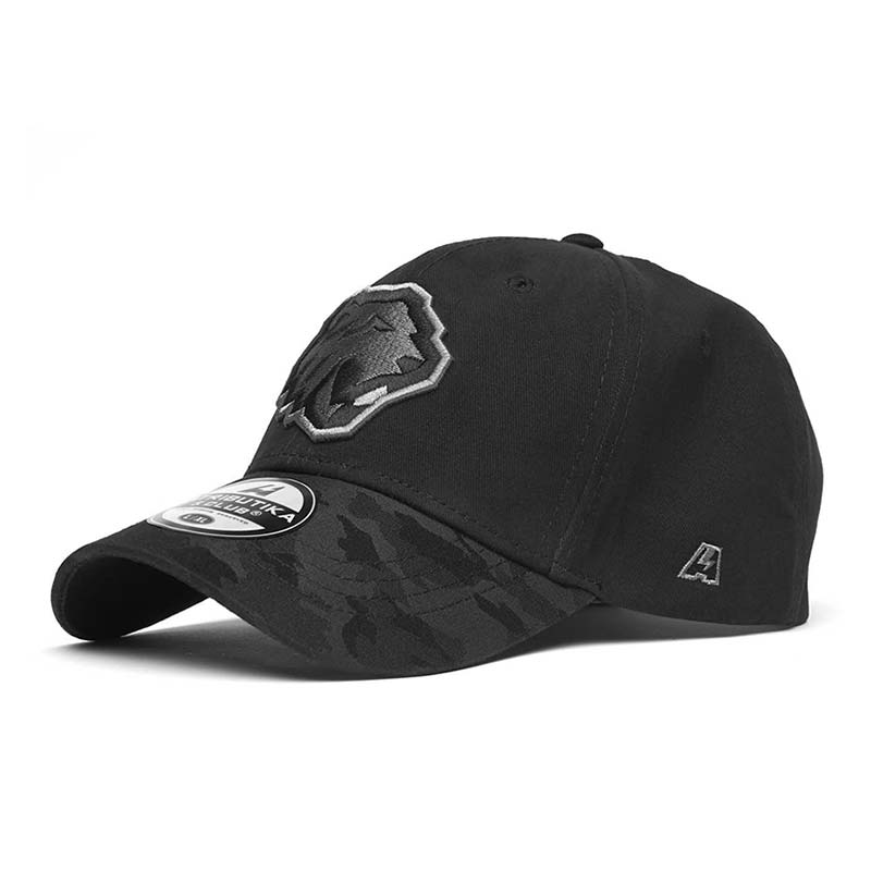 Бейсболка российского хоккейного клуба KHL Traktor. Материал 90% хлопок, 10% полиэстер. Размер L/XL российский 55-58. Глубина бейсболки 11 см. Вышивка в тон эмблемы по центру. Сзади вышивка названия клуба. Слева вышивка логотипа производителя. Свод бейсболки усилен, держит форму. Камуфляжный козырек изогнут и прошит. Длина козырька 7 см. Обод бейсболки с внутренней стороны прошит влагопоглощающей лентой. Задняя застежка регулирующая размер на металлическом фиксаторе с символикой клуба. Вентиляционные люверсы сверху. Производство Atributika & Club в КНР.
