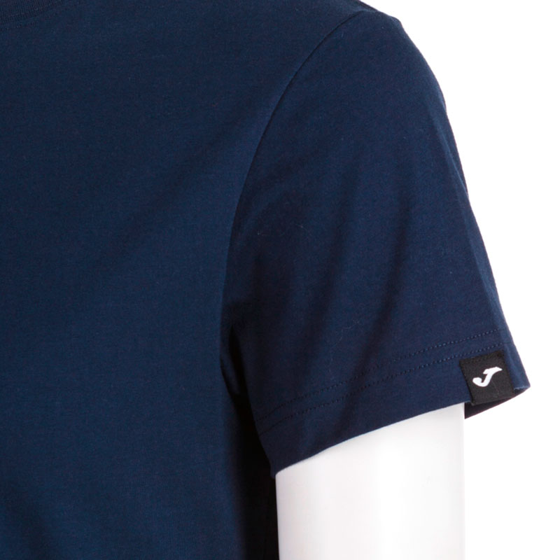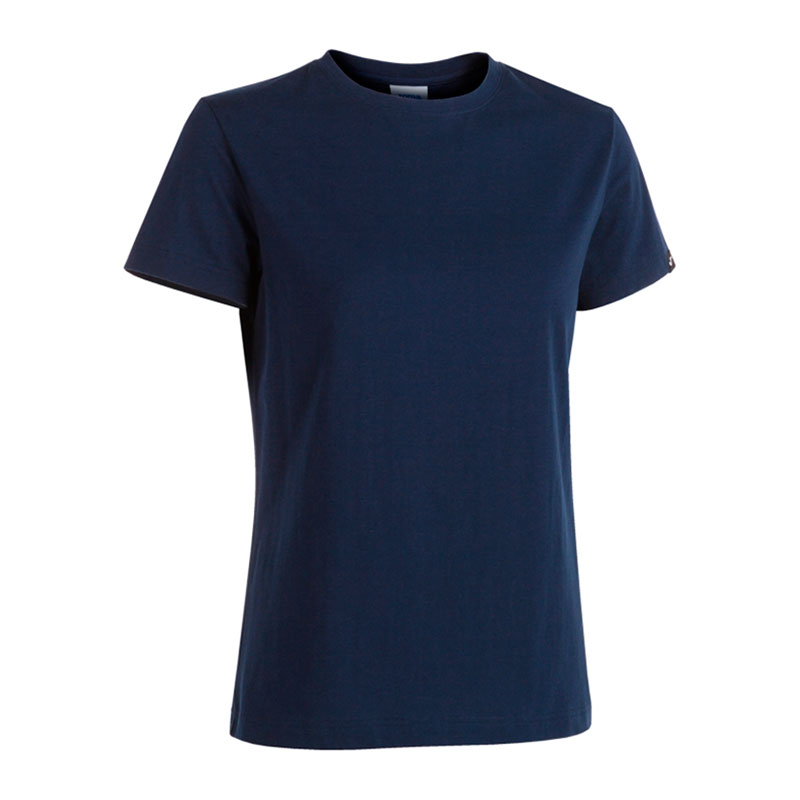 Футболка женская испанского бренда Joma. Классическая футболка с круглым воротом и коротким рукавом темно-синего цвета. Тонкий материал средней плотности 100% хлопок. На левом рукаве нашивка с логотипом производителя. Спина без вышивок и рисунков. Размер L российский размер 46. Длина футболки по спине 61 см (размер L). Деликатная стирка. Производство Joma в Пакистане.