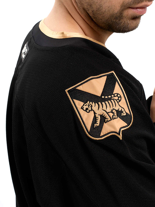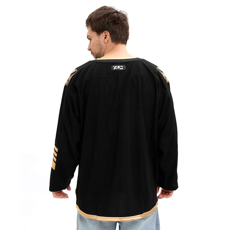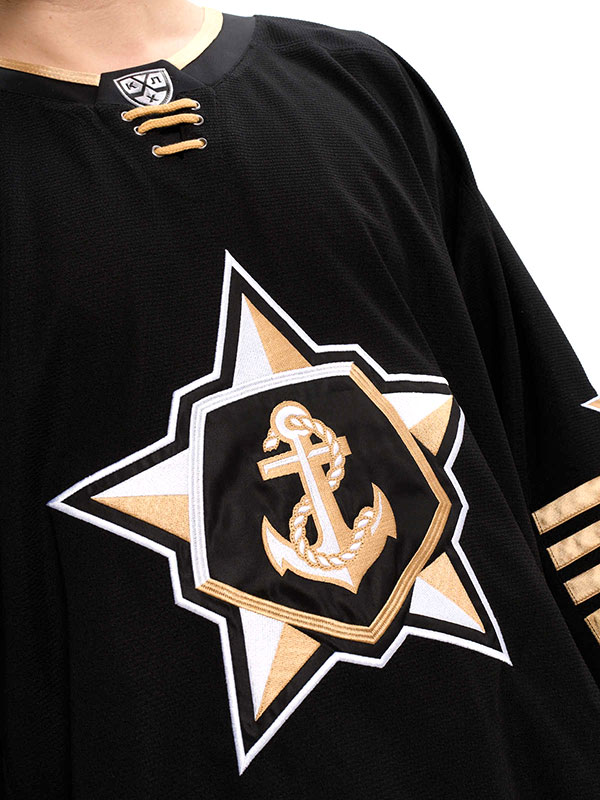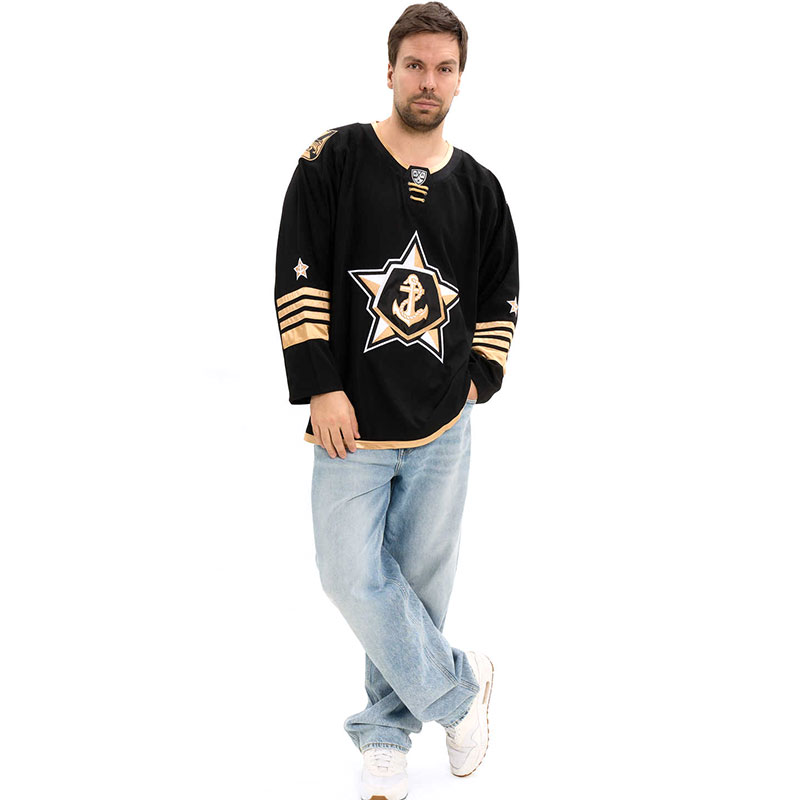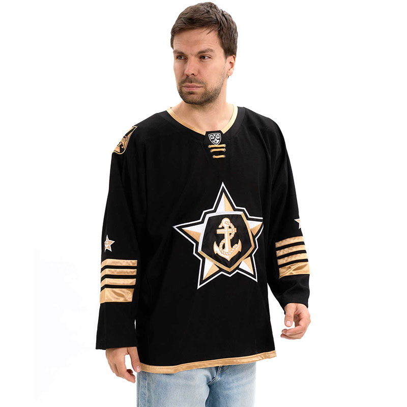 Хоккейное джерси российского клуба КХЛ Адмирал Владивосток. Классический хоккейный свитер с длинным рукавом и V-образным воротом. Хоккейный свитер изготовлен из легкого и прочного 100% полиэстера, подходит для игры в хоккей на любом уровне или для повседневной носки. Вышивка эмблемы клуба по центру. На плечах вышит герб Владивостока. Шевроны КХЛ и логотипа производителя. Длина по спине 80 см. Деликатная стирка. Производство Atributika & Club в КНР.