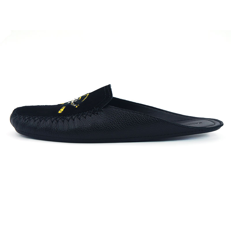 Мужские домашние тапочки-мокасины. Верх мокасин натуральная замша, внутри и подошва из натуральной телячьей кожи. Цвет черный. Закрытый мысок и открытый задник. Объемная, качественная вышивка по центру. Высота подошвы 0,6 см. Полнота тапочек G (7). Размеры 41 - 45. Фирменная коробка. Производство Family Россия.