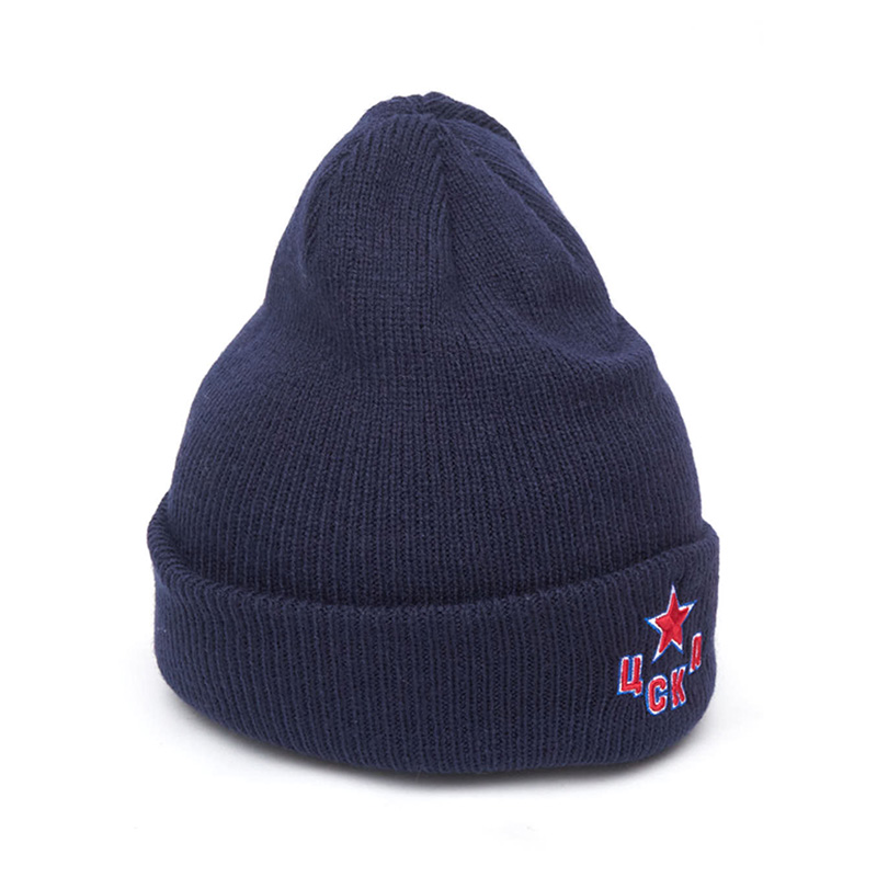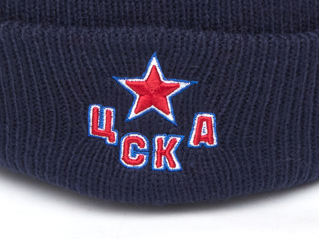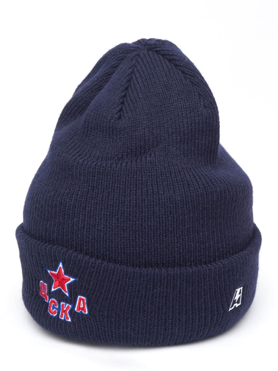 Шапка с отворотом хоккейного клуба КХЛ ЦСКА Москва. Материал 100% акрил. Размер L/XL, российский 55-60. По центру вышивка эмблемы клуба, слева вышивка логотипа производителя. Машинная стирка в холодной воде. Производство Atributika & Club в КНР.