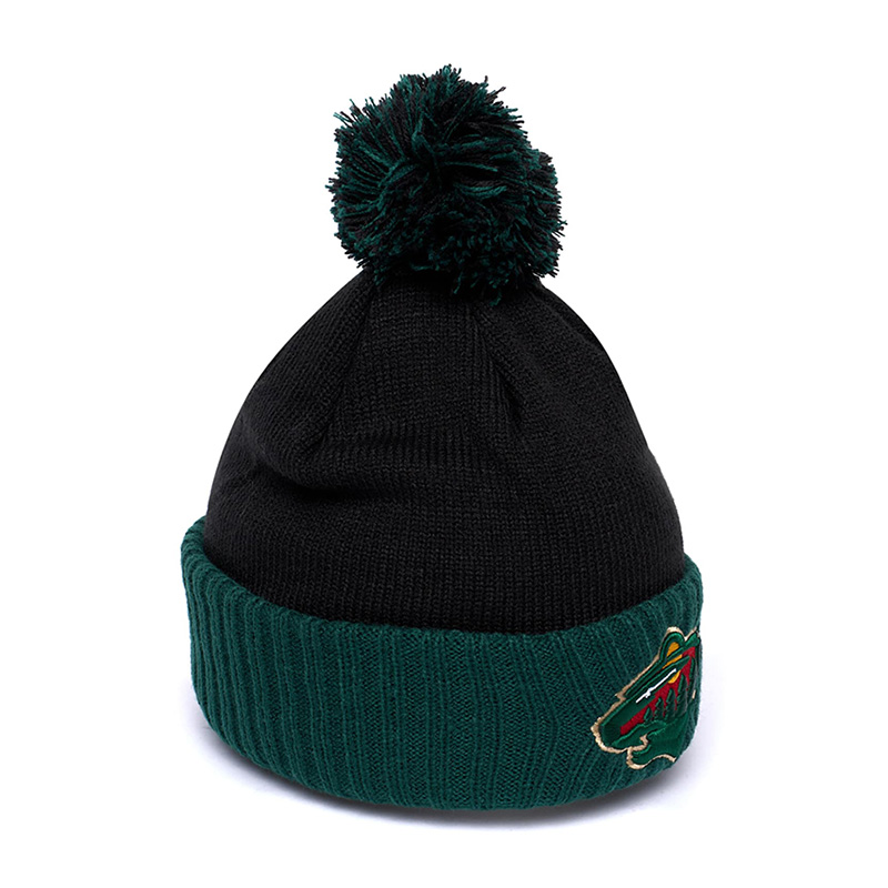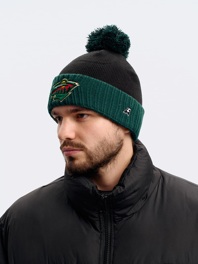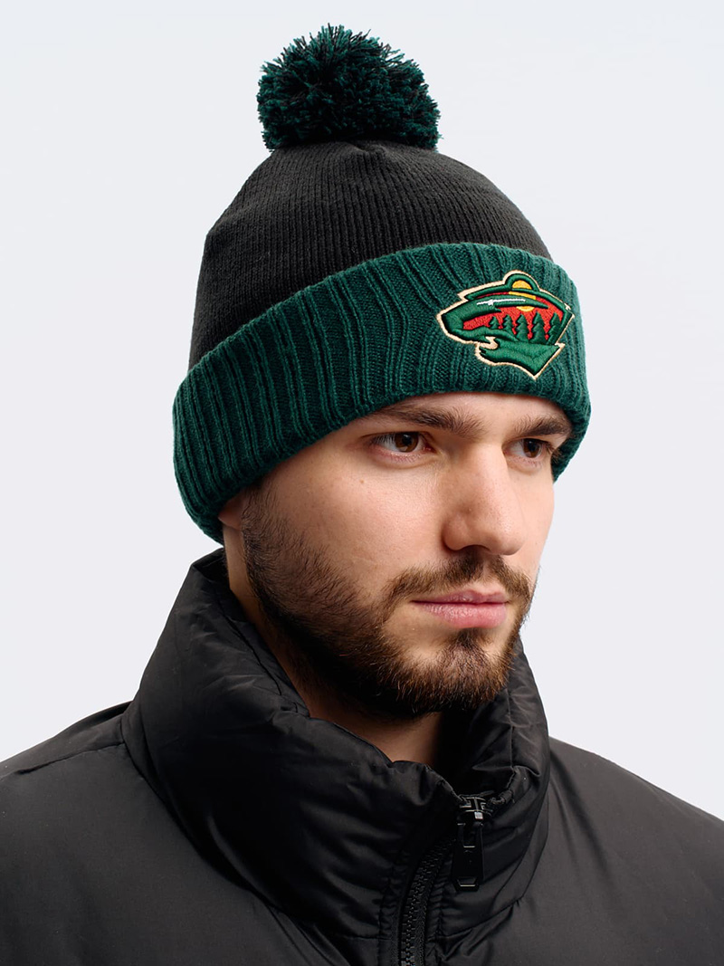 Шапка с помпоном и отворотом хоккейного клуба НХЛ Миннесота Уайлд. Материал акрил 100%. Размер L/XL, российский 55-60. По центру шапки вышивка эмблемы клуба, слева вышивка логотипа производителя. Ручная стирка. Производство Atributika & Club в КНР.