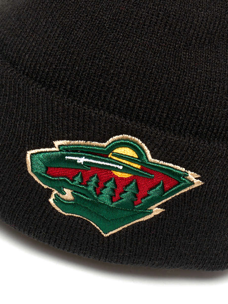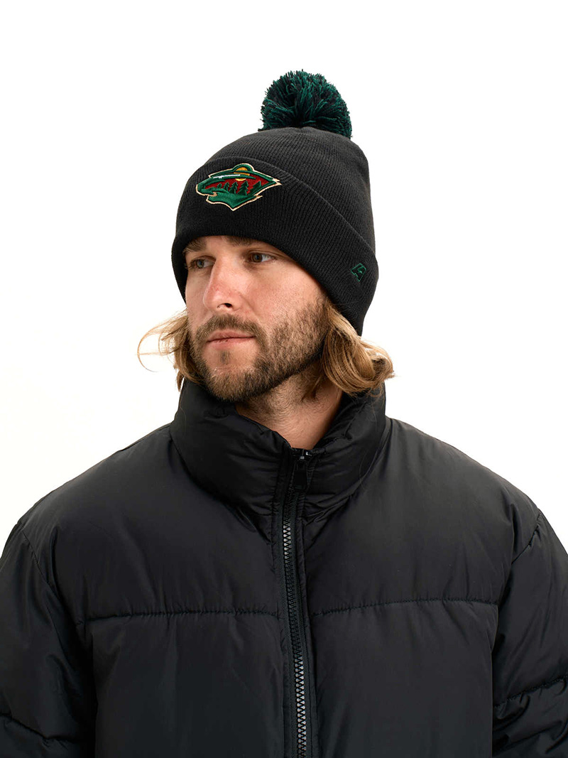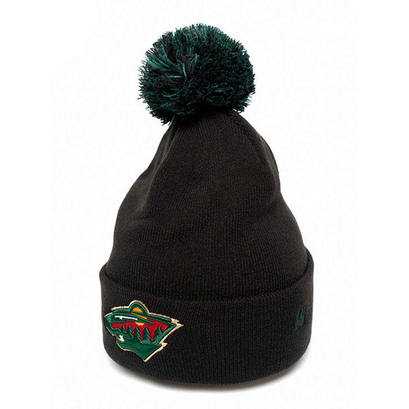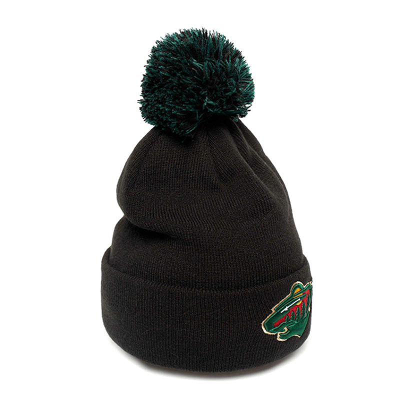 Шапка с помпоном и отворотом хоккейного клуба НХЛ Миннесота Уайлд. Материал акрил 100%. Размер L/XL, российский 55-60. По центру шапки вышивка эмблемы клуба, слева вышивка логотипа производителя. Ручная стирка. Производство Atributika & Club в КНР.