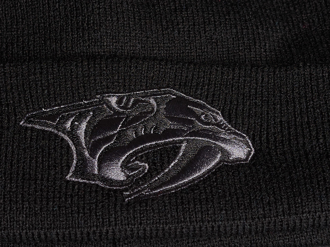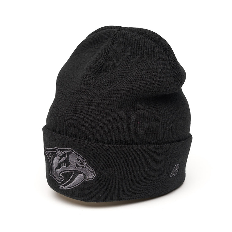 Шапка с отворотом хоккейного клуба НХЛ Нэшвилл Предаторз. Материал акрил 100%. Размер L/XL, российский 55-60. По центру шапки вышивка эмблемы клуба, слева вышивка логотипа производителя. Ручная стирка. Производство Atributika & Club в КНР.