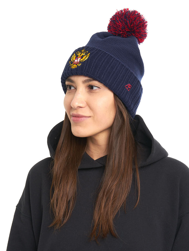 Шапка с помпоном и отворотом сборной России. Материал акрил 100%. Размер L/XL российский 55-60. По центру шапки вышивка герба России, слева вышивка логотипа производителя. Машинная стирка в холодной воде. Производство Atributika & Club в КНР.