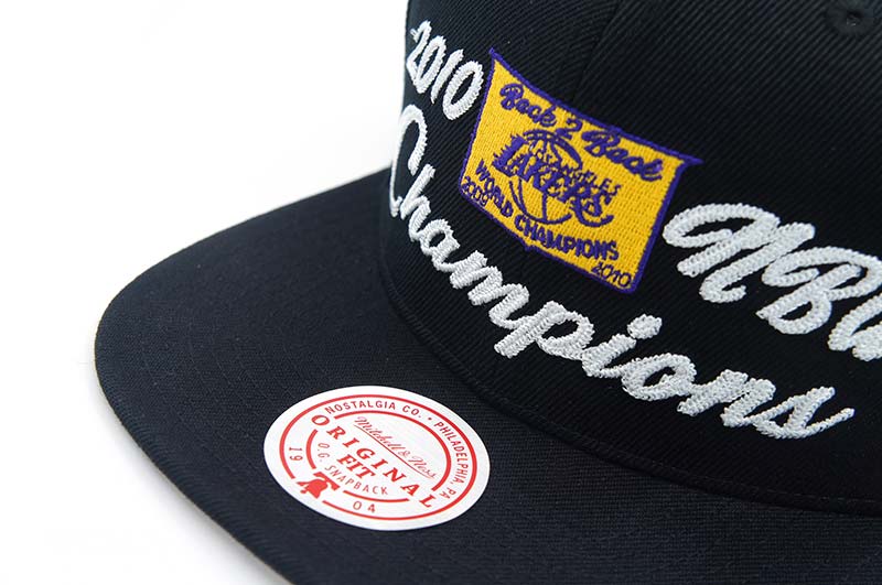 Бейсболка с прямым козырьком баскетбольного клуба НБА Лос-Анджелес Лейкерс. Лимитированная серия бейсболок чемпионов НБА 2010 года. Плотный материал 85% акрил, 15% шерсть. Размер универсальный 56-61. Глубина бейсболки 11,5 см. Нормальная посадка. По центру вышивка эмблемы клуба и чемпионской символики. Сзади вышивка логотипа производителя. Свод бейсболки усилен, держит форму. Прямой козырек прошит. Длина козырька 7 см. Внутренняя часть козырька серого цвета. Задняя застежка регулирующая размер на передвижном пластиковом фиксаторе. Внутренняя сторона обода кепки прошита влагопоглощающей лентой. Вентиляционные люверсы сверху. Производство Mitchell & Ness в КНР.
